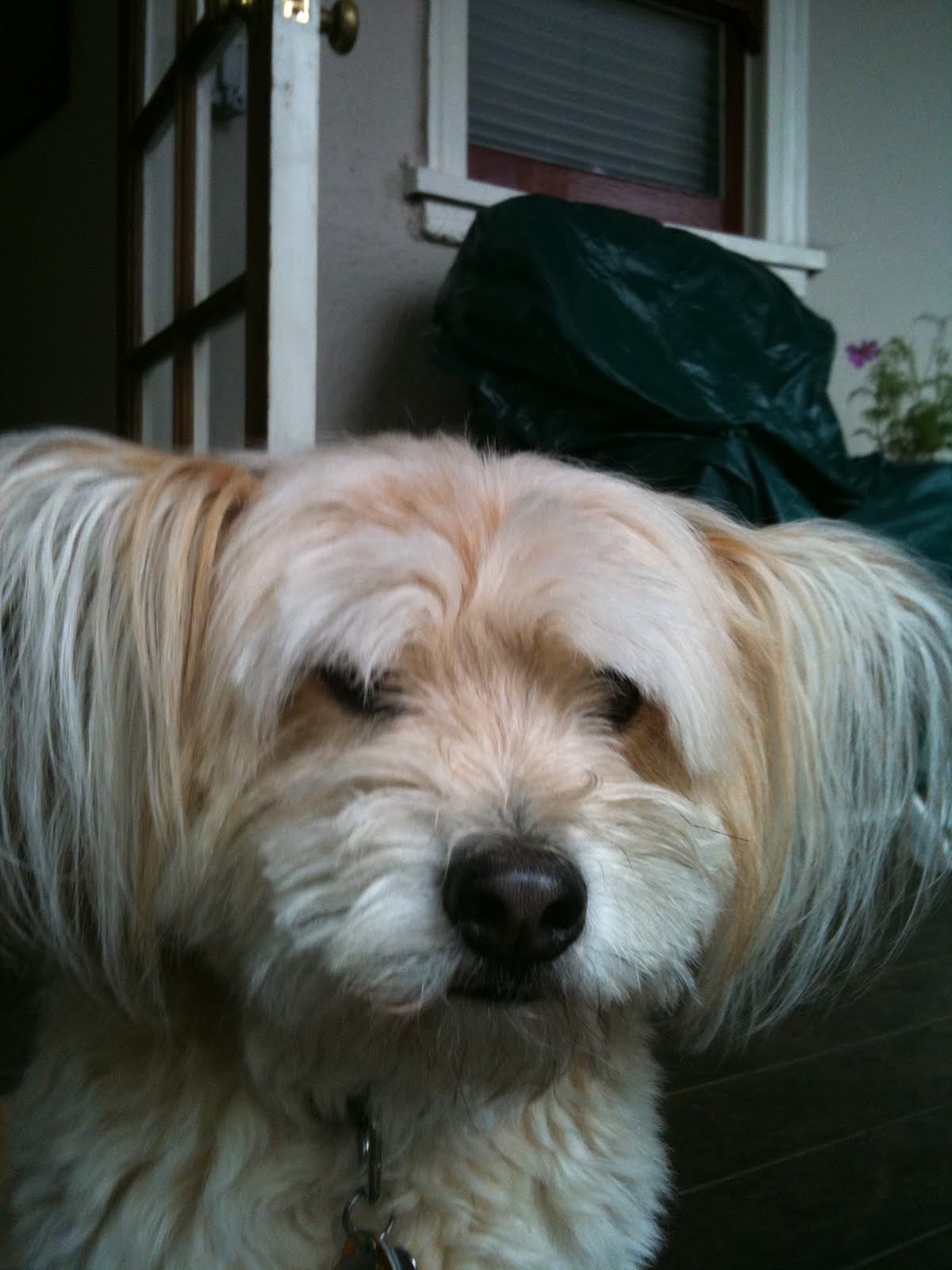 this is Reuben, the wonder dog, fur pal of my gal pal Monza. He is very cuddly and older than my Lady dog. She wanted to play more than he want to be played with--the source of some discord. |